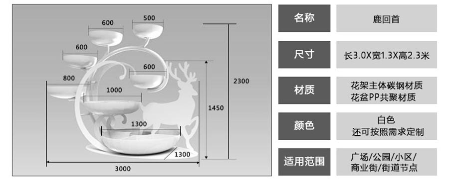 【規 格】3000mm×1300mm×2300mm;【材 質】花盆:PP共聚材質 花架: 碳鋼噴塑;