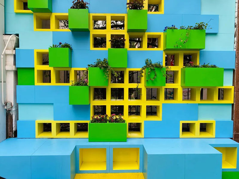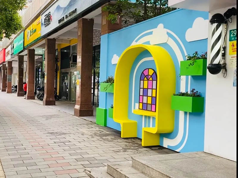 檸檬黃、玫瑰紅、孔雀藍……全新的“街道名片墻”選取歡快的色彩、色調和同色系的色譜,為生活增添了一道跳躍的美好。